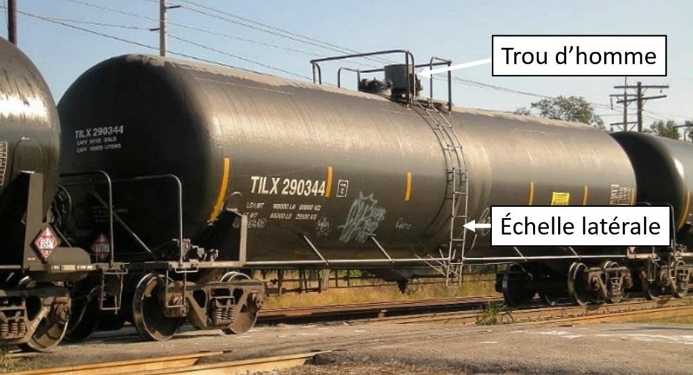 S'approchant du train, les 2 adolescentes sont montées sur un wagon-citerne près de la queue du train en gravissant l'échelle latérale et en se hissant sur la plateforme au-dessus du wagon, où le trou d'homme est situé (figure 2).
