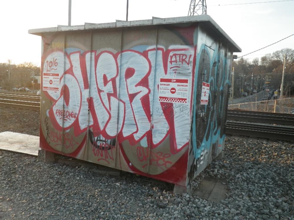 La perceptibilité d'un panneau d'avertissement désigne la manière dont il peut capter l'attention d'un observateur qui ne s'attend pas nécessairement à la présence d'un tel panneauNote de bas de page 13. Dans le présent événement, les seuls panneaux indicateurs d'entrée interdite « No Trespassing » étaient ceux apposés sur la guérite de signalisation immédiatement au sud de la voie 1. Ces panneaux d'avertissement étaient de couleur rouge et blanc, les mêmes couleurs que certains graffitis sur la guérite de signalisation (figure 5).
