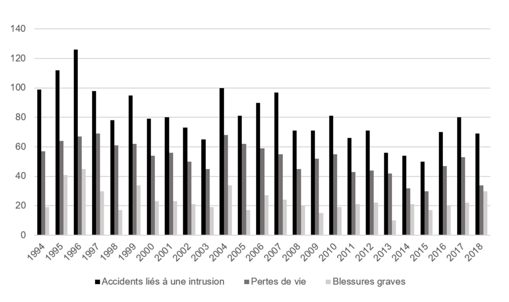 En 2018, on a dénombré 69 accidents liés à une intrusion, ce qui est légèrement supérieur à la moyenne annuelle de 67 des 10 dernières années. Les 69 accidents liés à une intrusion en 2018 ont causé la mort de 34 personnes et des blessures graves à 30 autres.