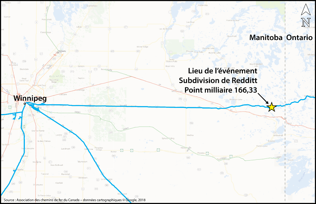 Le 5 janvier 2018, vers 19 h 25, heure normale de l'EstNote de bas de page 1, le train a quitté Sioux Lookout (Ontario) sur la subdivision de Redditt du CN. Le train était composé de 2 locomotives en tête de train, 21 wagons chargés, 32 wagons vides et 11 wagons-citernes de résidus. Le train pesait environ 4343 tonnes et mesurait quelque 4334 pieds de long. L'équipe était formée d'un mécanicien de locomotive et d'un chef de train. Les 2 membres de l'équipe étaient qualifiés pour leur poste respectif, connaissaient bien le territoire et satisfaisaient aux exigences de repos et de condition physique établies.