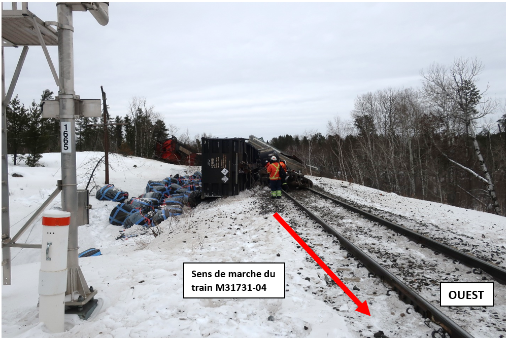 Le 6 janvier 2018, vers 1 h 25, heure normale du Centre, le train de marchandises M31731 04 de la Compagnie des chemins de fer nationaux du Canada circulait vers l’ouest à environ 50 mi/h sur la subdivision de Redditt lorsqu’un freinage d’urgence s’est déclenché. Une inspection subséquente a révélé que 23 wagons (du 38e wagon au 60e wagon à partir de la tête du train) avaient déraillé au point milliaire 166,33. Huit des wagons déraillés, dont un wagon de résidus, transportaient des marchandises dangereuses. Il n’y a eu ni blessure ni déversement.