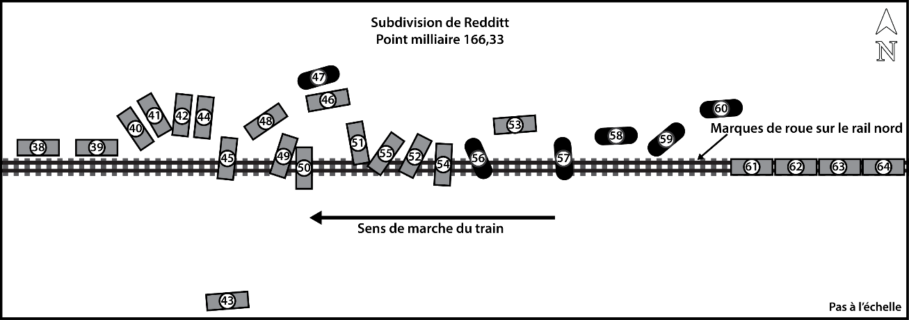 Une inspection subséquente a permis de déterminer que 23 wagons, du 38e au 60e, à partir de la tête du train, avaient déraillé au point milliaire 166,33.