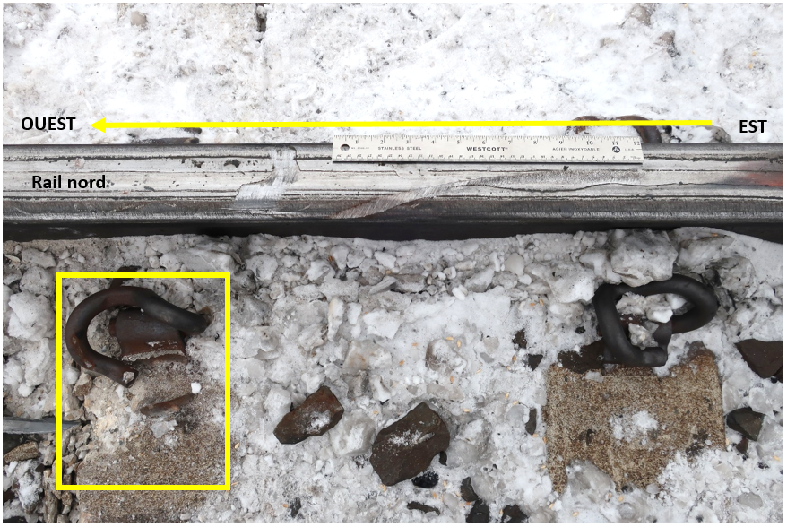 À l’extrémité est du lieu du déraillement, on a observé une marque de roue sur la table de roulement du rail nord au point milliaire 166,33. Cette marque commençait au centre de la table de roulement et se prolongeait sur 9 pouces vers l’ouest et vers le côté intérieur du rail. On a observé un petit morceau de table de roulement entre les rails à côté de la marque de roue. Immédiatement à l’ouest de la marque de roue, l’attache de rail (côté intérieur) et la traverse en béton étaient endommagés (figure 5).