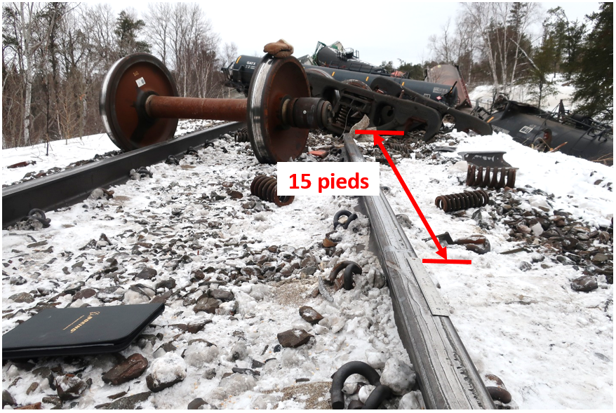 Le déraillement s’est produit lorsque la roue R4 du wagon ATW 400515 a fini par céder à cause d’une fissure verticale de la jante qui se formait depuis un certain temps. La rupture par fissure verticale de la jante s’est propagée sur la circonférence de la roue, en directions opposées à partir du point d’origine, pour atteindre une longueur de 68 pouces. La partie en saillie non supportée de la jante de roue s’est séparée de la roue, et la roue est tombée du côté intérieur du rail nord au point milliaire 166,33.