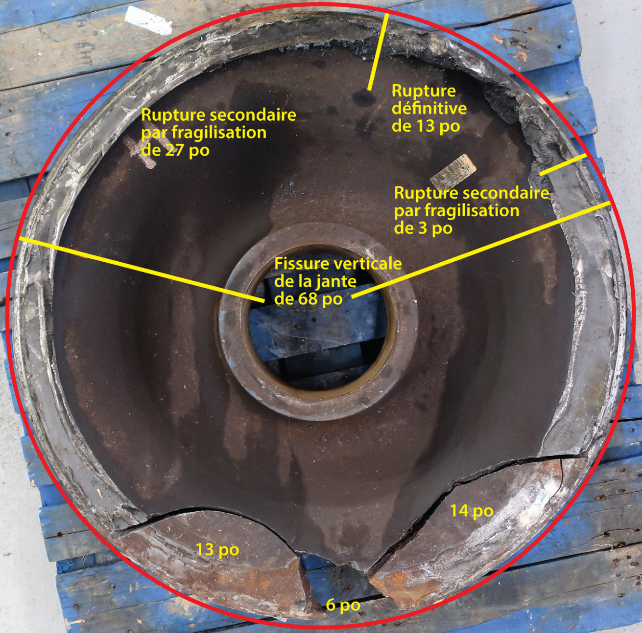 L’éclatement d’une jante est habituellement attribuable à un défaut de fabrication engendrant une fissure qui se propagera horizontalement dans un plan parallèle à la table de roulement. À la longue, ce défaut atteindra la surface de roulement qui se rompra graduellement sous l’effet du défibrageNote de bas de page 2 ou de l’écaillageNote de bas de page 3 de la table de roulement. Une roue qui se rompt en service cause souvent un déraillement, ce qui peut engendrer de lourdes conséquences. L’industrie ferroviaire a donc mis en œuvre plusieurs initiatives pour réduire de telles défaillances :