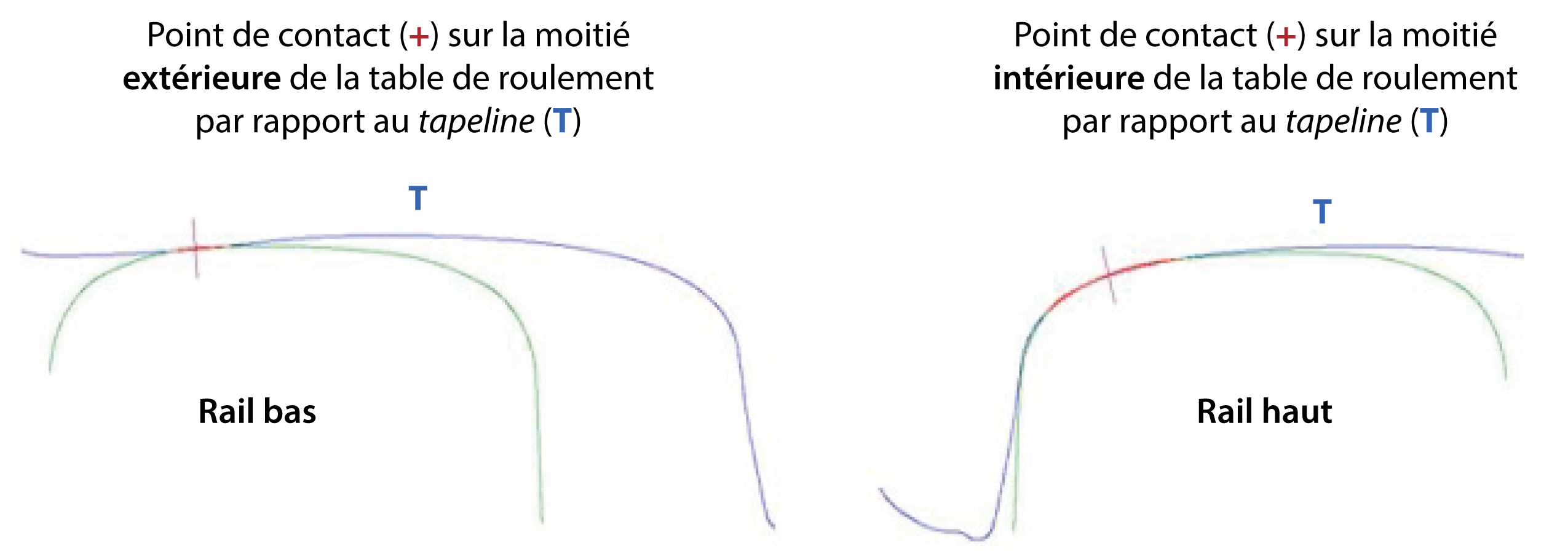 Les charges d’impact mesurées par le DDR sur la voie en alignement et par le DDR installé dans la courbe sont comparées. Si l’on constate d’importantes différences entre elles, cela indique habituellement des roues endommagées sur ou près du bord de leur table de roulement, du côté extérieur de la roue. L’un des défis d’installation de ce système consiste à trouver des courbes qui permettent des vitesses relativement élevées et une courbure de plus de 7°.