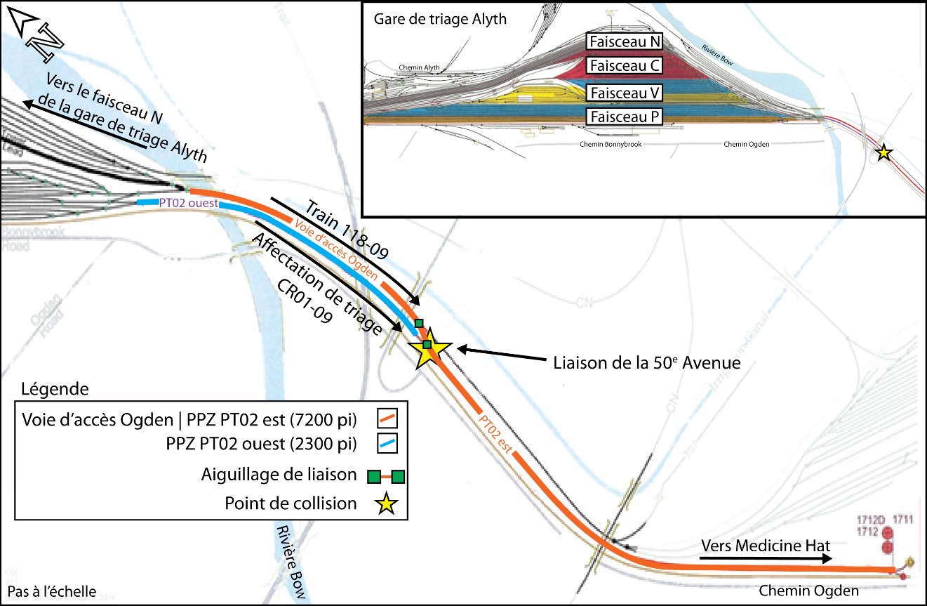 Vers 8 h 59, l’équipe du train 118 a reçu l’autorisation de partir vers Medicine Hat. La trajectoire de départ commençait au faisceau de voies N, suivait la PPZ de la voie d’accès Ogden/PT02 est vers l’est, dépassait les signaux au 1712, puis rejoignait la voie principale. D’après la communication radio antérieure avec l’équipe d’affectation, les membres de l’équipe du train 118 croyaient qu’ils étaient toujours autorisés à occuper entièrement la PPZ de la voie d’accès Ogden/PT02 est.