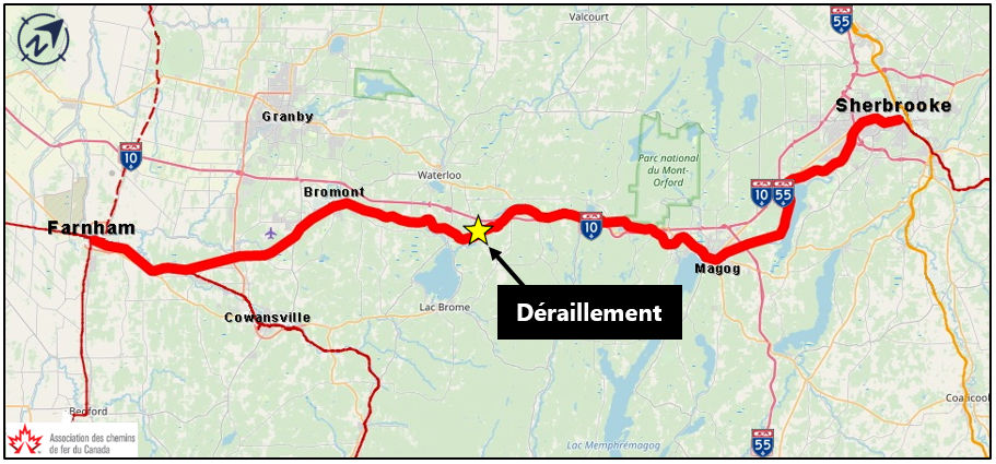 Vers 16 h 40, alors que le train circulait à 16 mi/h près de Bolton-Ouest (Québec) (figure 1), un freinage d’urgence provenant de la conduite générale s’est déclenché. Une fois le train immobilisé, l’équipe l’a inspecté et a constaté que 6 wagons (du 39e au 44e après les locomotives de tête) avaient déraillé et gisaient en diverses positions le long de l’emprise à partir du point milliaire 103,73 de la subdivision de Sherbrooke. Avant le déclenchement du freinage d’urgence, l’équipe n’avait remarqué aucune anomalie de la voie ou de la conduite du train. Personne n’a été blessé et il n’y a eu aucun déversement de marchandises dangereuses.