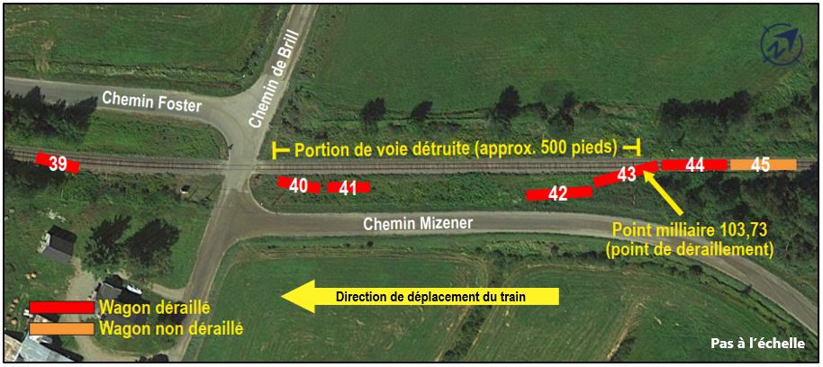Le 39e wagon était le premier à avoir déraillé. Il était debout, encore en partie sur la voie, à environ 225 pieds à l’ouest du passage à niveau du chemin de Brill. Les 40e et 41e wagons étaient couchés sur le côté, à environ 50 pieds à partir de l’est du passage à niveau. Le 42e wagon était couché sur le côté, en contrebas de l’emprise ferroviaire. Le 43e wagon gisait debout en travers de la voie et était toujours attelé avec le wagon suivant (le 44e wagon), qui se trouvait debout sur la voie ferrée. Le 45e et dernier wagon du train était debout et n’avait pas déraillé (figure 2). Les 3 premiers wagons déraillés étaient des wagons couverts chargés de rouleaux de papier, alors que les 3 derniers étaient des wagons plats à longrine centrale chargés de planches de bois.