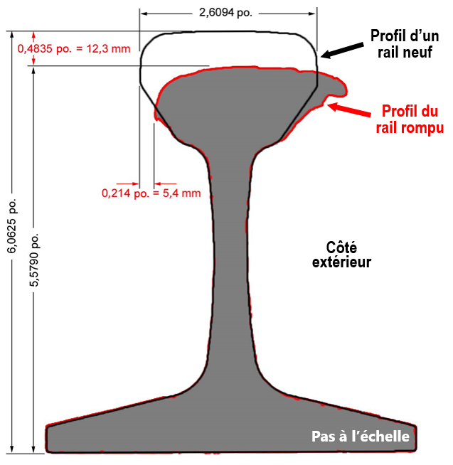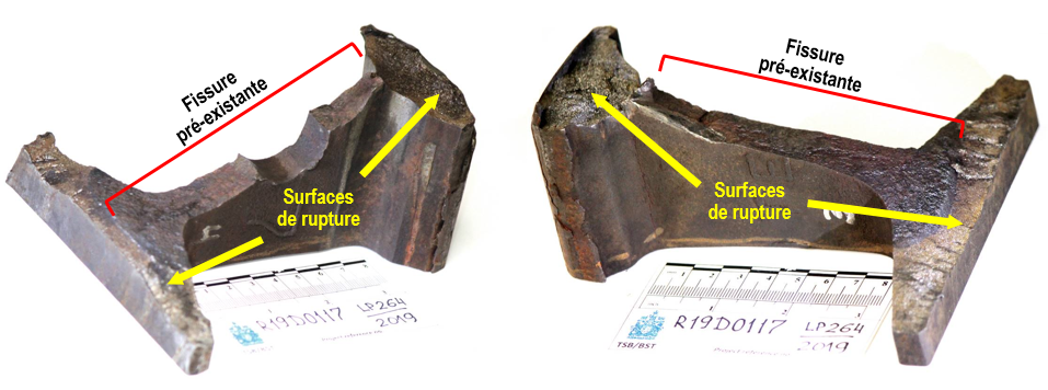 Une section du rail rompu d’environ 20 pouces de long, ainsi que la section de 9 pouces de long trouvée parmi les débris, ont été envoyées au Laboratoire d’ingénierie du BST pour fins d’examen.