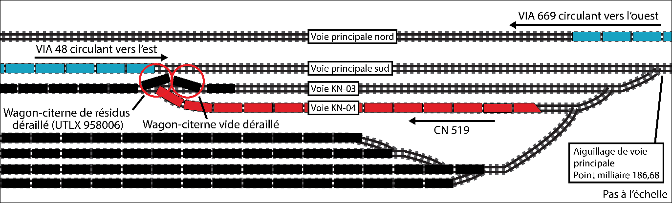 L’équipe du CN 519 ne savait pas que son mouvement avait été poussé au-delà de l’extrémité ouest de la voie KN-04 et avait frappé de flanc 2 wagons-citernes qui se trouvaient sur la voie KN-03, les faisant dérailler vers le nord ainsi obstruer la voie principale sud de la subdivision Kingston (figure 5).