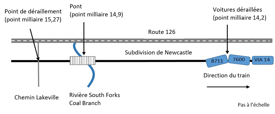 Le 4 avril 2019, vers 12 h 35, heure avancée de l’Atlantique, le train de voyageurs no 14 de VIA Rail Canada Inc. (VIA) (VIA 14 ou « le train ») roulait vers l’est à environ 60 mi/h lorsque les 2 derniers wagons (VIA 7600 et VIA 8711) ont déraillé au point milliaire 15,27 de la subdivision de Newcastle de la Compagnie des chemins de fer nationaux du Canada (CN). VIA 14 traversait le passage à niveau du chemin Lakeville lorsque les 2 voitures passagers ont déraillé, sans se renverser. Le train s’est immobilisé avec la locomotive de tête au point milliaire 14,2. Trois passagers ont subi des blessures légères. Aucune marchandise dangereuse n’a été en cause.