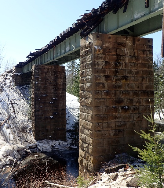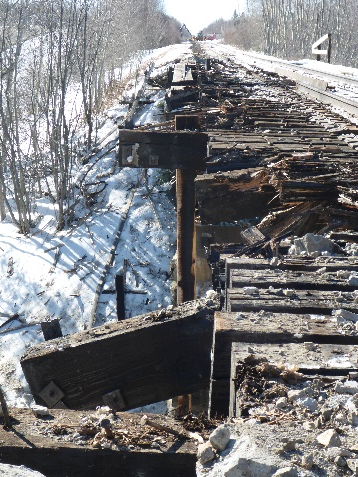 Au point milliaire 14,9 de la subdivision de Newcastle du CN, il y avait un pont d’acier à tablier ajouré. Le pont avait une longueur de 133,5 pieds et s’appuyait sur 2 culées de pierres, 2 piles de pierre et une assise de pont de béton. Sur le pont, la voie était constituée de rails de 100 livres, avec des contre-rails (aussi appelés rails Jordan)Note de bas de page 3 de 100 livres installés à 9 pouces des rails de roulement. La culée de pierre du côté nord-ouest du pont avait été endommagée par la collision avec l’une des voitures déraillées. Les contre-rails et environ 100 traverses avaient également subi des dommages au cours de l’événement (figure 4 et 5).