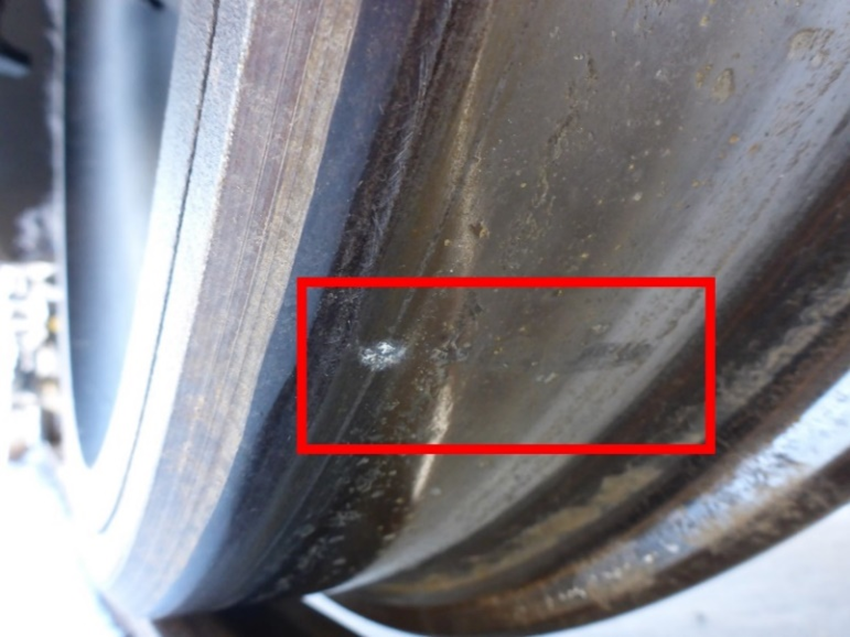 Le reste du train n’avait pas déraillé. Tous les essieux montés de la 2e à la 12e voiture présentaient des marques d’impact sur les roues du côté nord, probablement causées par le contact avec le rail brisé (figure 6). Ces marques étaient progressivement moins visibles sur les essieux montés des voitures vers la tête. Sur les locomotives et la première voiture, aucune marque n’était visible sur les essieux montés.