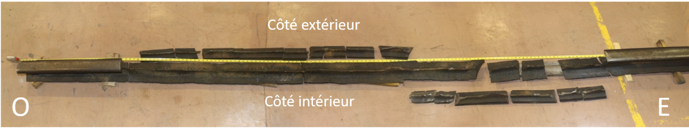 - Tous les fragments de rail montraient une forte corrosion généralisée, particulièrement sur l’âme et le patin du rail.