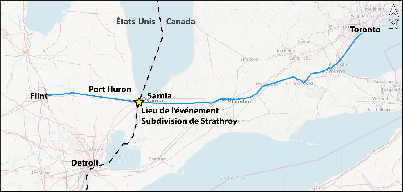 Vers 17 h 05, le train a quitté la gare de triage MacMillan à destination de Walbridge (Ohio, États-Unis) en passant par Flint (Michigan, États-Unis). Après avoir quitté la gare de triage MacMillan, le train a emprunté les subdivisions de Halton, d’Oakville, de Dundas et de Strathroy du CN jusqu’à Sarnia (Ontario, Canada) (figure 1).