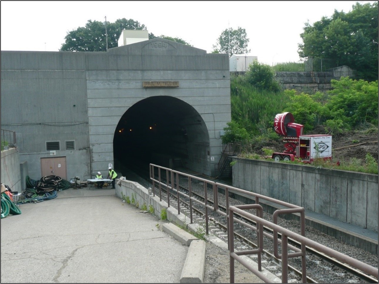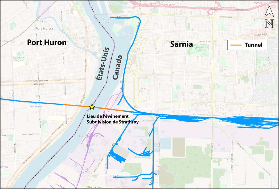 Vers 1 h 55 le 28 juin 2019, le train est arrivé à la gare de triage de Sarnia, située au point milliaire 52,7 de la subdivision de Strathroy. À Sarnia, une équipe de train montante de 3 personnes, composée d’un mécanicien de locomotive (ML), d’un chef de train et d’un chef de train adjoint, a pris les commandes du train en vue de la traversée prévue du tunnel Paul M. Tellier du CN sous la rivière Sainte-Claire. Le tunnel (figure 2) relie Sarnia à Port Huron (Michigan, États-Unis) et traverse la frontière internationale entre le Canada et les États-Unis au point milliaire 60,63 de la subdivision de Strathroy du CN. Les membres de l’équipe de train montante possédaient les qualifications requises pour leur poste, connaissaient bien le territoire et satisfaisaient aux exigences en matière de repos et d’aptitude au travail.