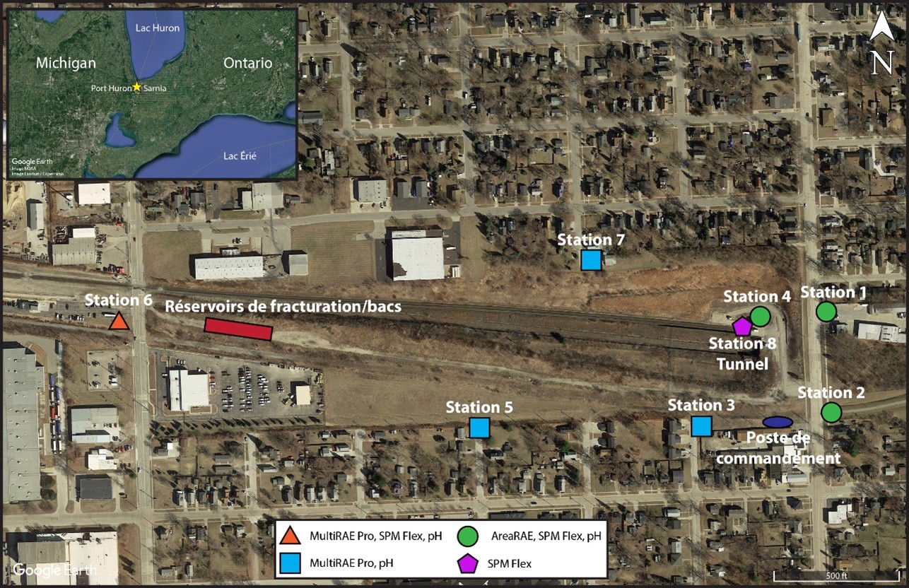 L’EPA a établi 8 stations permanentes de surveillance de la qualité de l’air dans le périmètre (figure 4), 2 près du portail ouest du tunnel (stations 4 et 8) et 6 autour des lieux et des aires de transit. Des moniteurs AreaRAENote de bas de page 14 ou MultiRAENote de bas de page 15 ont été installés à 7 de ces stations afin d’assurer une surveillance générale de la qualité de l’air. Des unités SPM FlexNote de bas de page 16 ont également été déployées à 5 de ces stations pour surveiller de façon spécifique la présence d’acide sulfurique dans l’air.