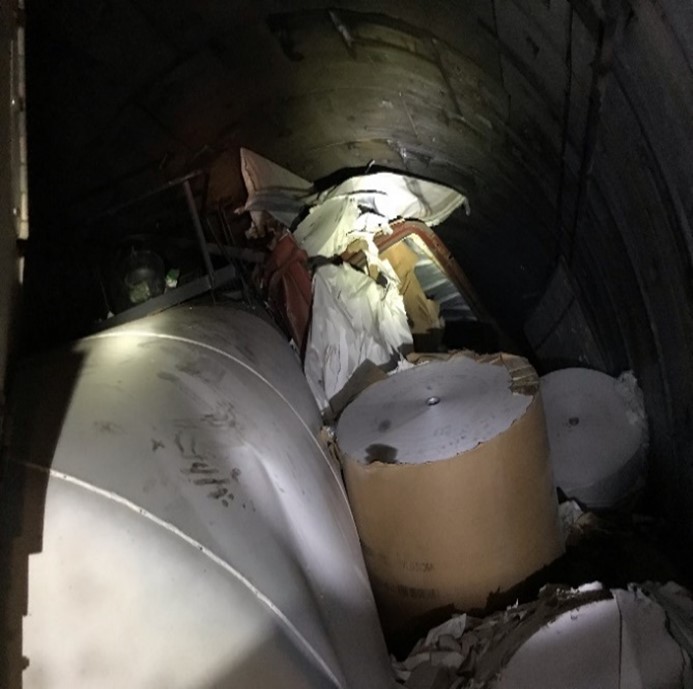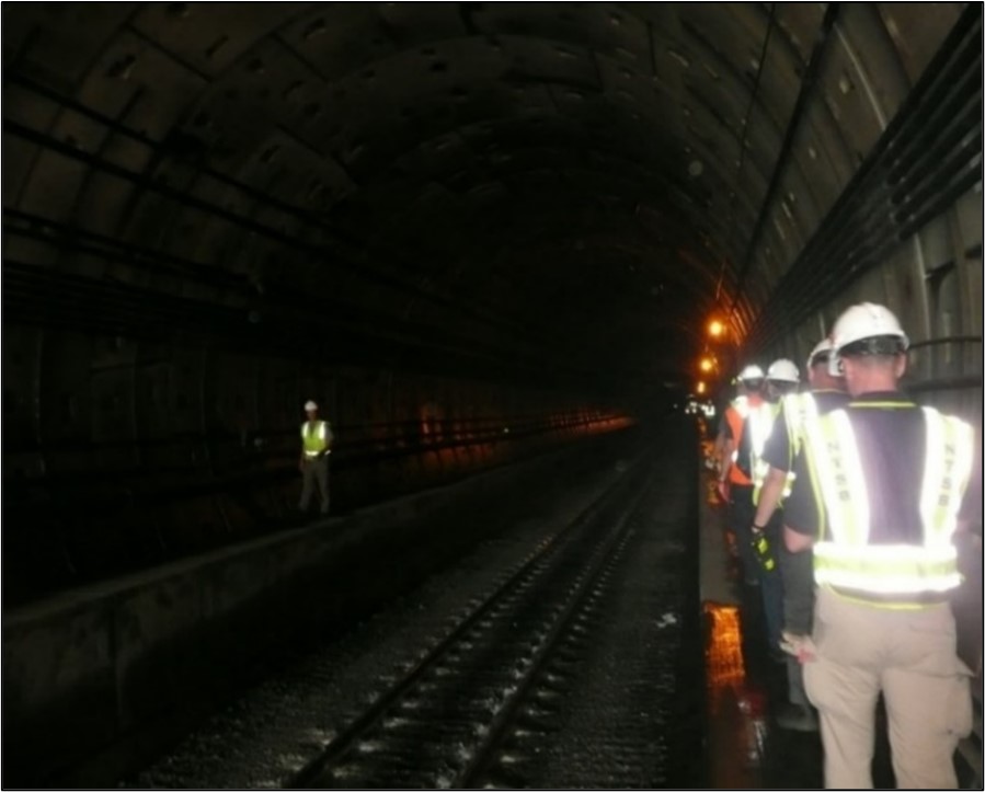 Le 29 juin 2019, après la réunion d’avancement conjointe à Port Huron, le personnel du CN a accompagné les enquêteurs du BST et du NTSB lorsqu’ils sont entrés dans le tunnel du côté américain pour examiner le matériel roulant déraillé et les dommages connexes (figure 5).
