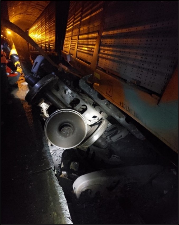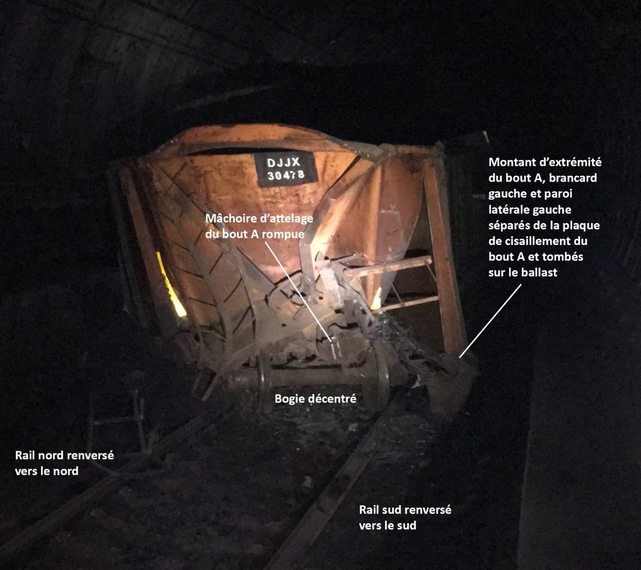Toutes les roues du wagon DJJX 30478 (53e position) avaient déraillé et le bout A était lourdement endommagé. Le montant d’extrémité, le brancard et la tôle latérale s’étaient séparés de la plaque de cisaillement du côté gauche du bout A et semblaient s’être affaissés. Le bogie du bout A était décentré sur la diagonale. Le rail nord s’était renversé du côté nord et le rail sud du côté sud, vers les parois de renfort du tunnel. La mâchoire d’attelage du bout A était rompue (figure 6).