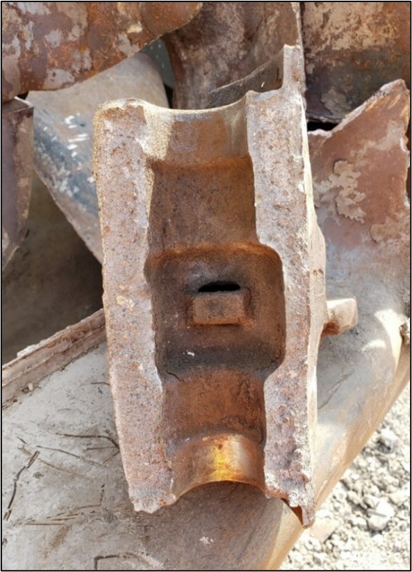La surface de rupture de la mâchoire d’attelage rompue du bout A du wagon DJJX 30478 (53e position) présentait des caractéristiques de rupture fragile, mais aucune défectuosité visible (figure 7). Le bout A du wagon présentait également un certain nombre de défectuosités de carrosserie préexistantes qui laissaient croire que son intégrité structurale avait peut-être été compromise. Il n’y avait aucune marque visible d’impact sur les parois de renfort de tunnel adjacentes dans cette zone.