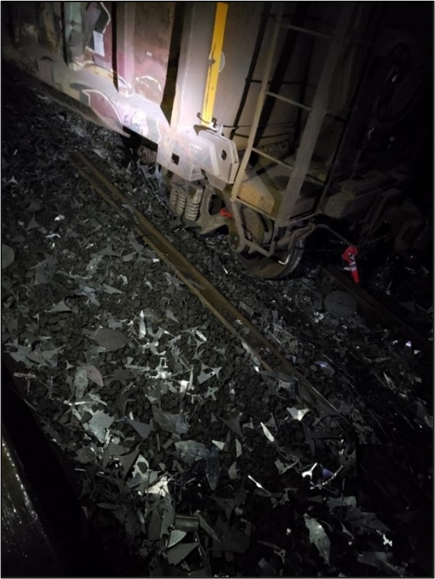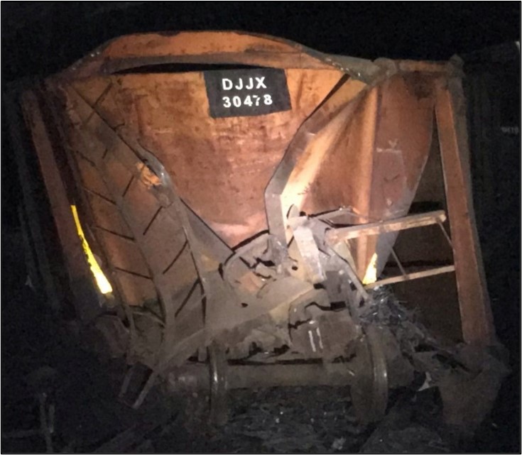 Le premier matériel roulant déraillé que l’équipe a vu dans le tunnel était l’extrémité arrière du wagon-tombereau à fond plat DJJX 19371 (51e position) chargé de ferrailles.
