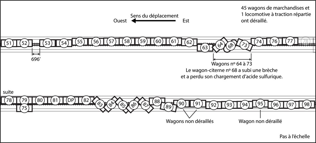 Pendant qu’il se trouvait dans le tunnel, le chef de train avait constaté que les roues arrière du wagon DJJX 19371 (51e position) avaient déraillé, tandis que toutes celles du wagon suivant, DJTX 30049 (52e position), avaient déraillé. Dans l’obscurité du tunnel, aucun autre wagon n’était visible derrière ce wagon. Par conséquent, cet événement a d’abord été signalé comme étant une séparation de train accompagnée du déraillement de 2 wagons. Cependant, à mesure que les intervenants d’urgence et le personnel du CN ont commencé à arriver, il est devenu évident qu’un accident beaucoup plus grave s’était produit.