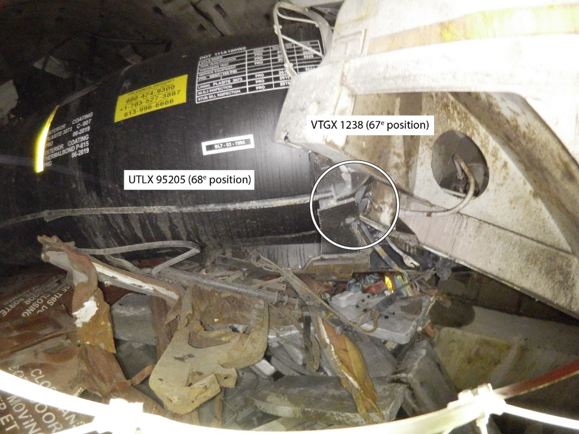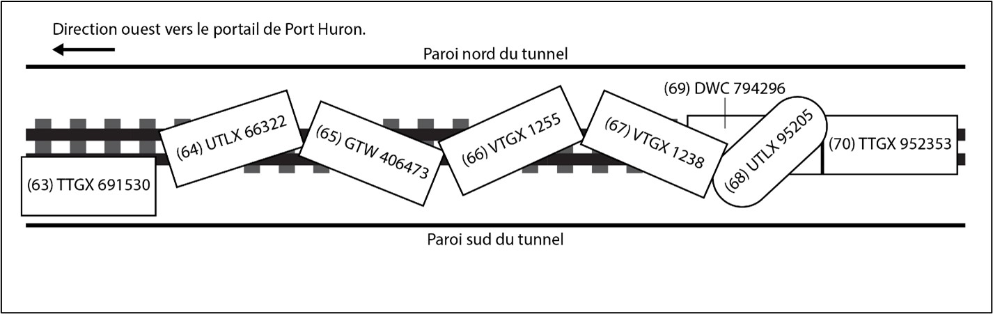 À l’insu de l’équipe à ce moment-là, 45 wagons de marchandises et la locomotive à TR télécommandée, situés entre les 51e et 98e positions inclusivement, avaient déraillé; les 90e, 91e et 95e positions n’avaient pas déraillé. Les wagons déraillés s’étaient empilés et immobilisés de part et d’autre de la frontière internationale à l’intérieur du tunnel, le bloquant complètement. Parmi les wagons déraillés figurait le wagon-citerne de MD UTLX 95205 (68e position), qui était chargé de 12 727 gallons américains (48 177 L) d’acide sulfurique à 94 % (numéro ONU 1830, classe 8, groupe d’emballage [GE] II). Au cours du déraillement, le wagon-citerne UTLX 95205 avait subi une brèche et avait déversé de l’acide sulfurique dans le tunnel.