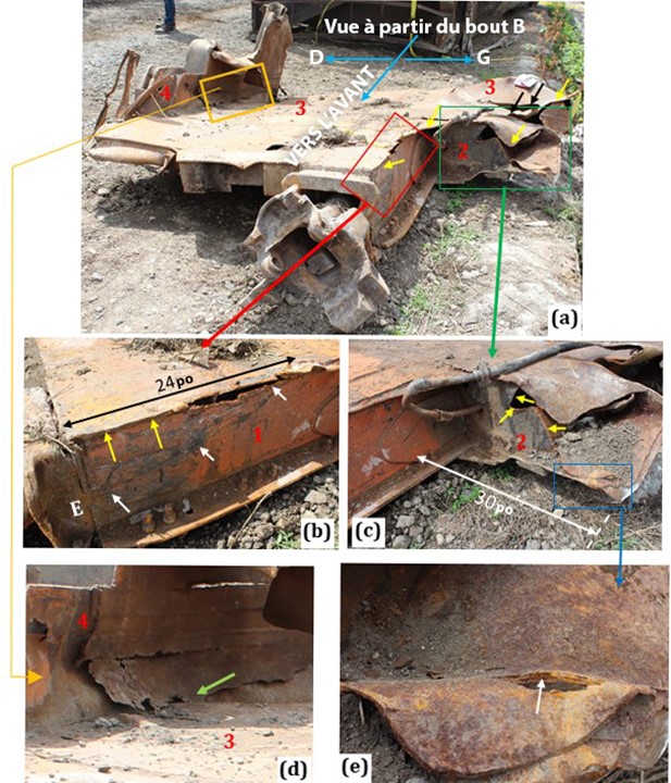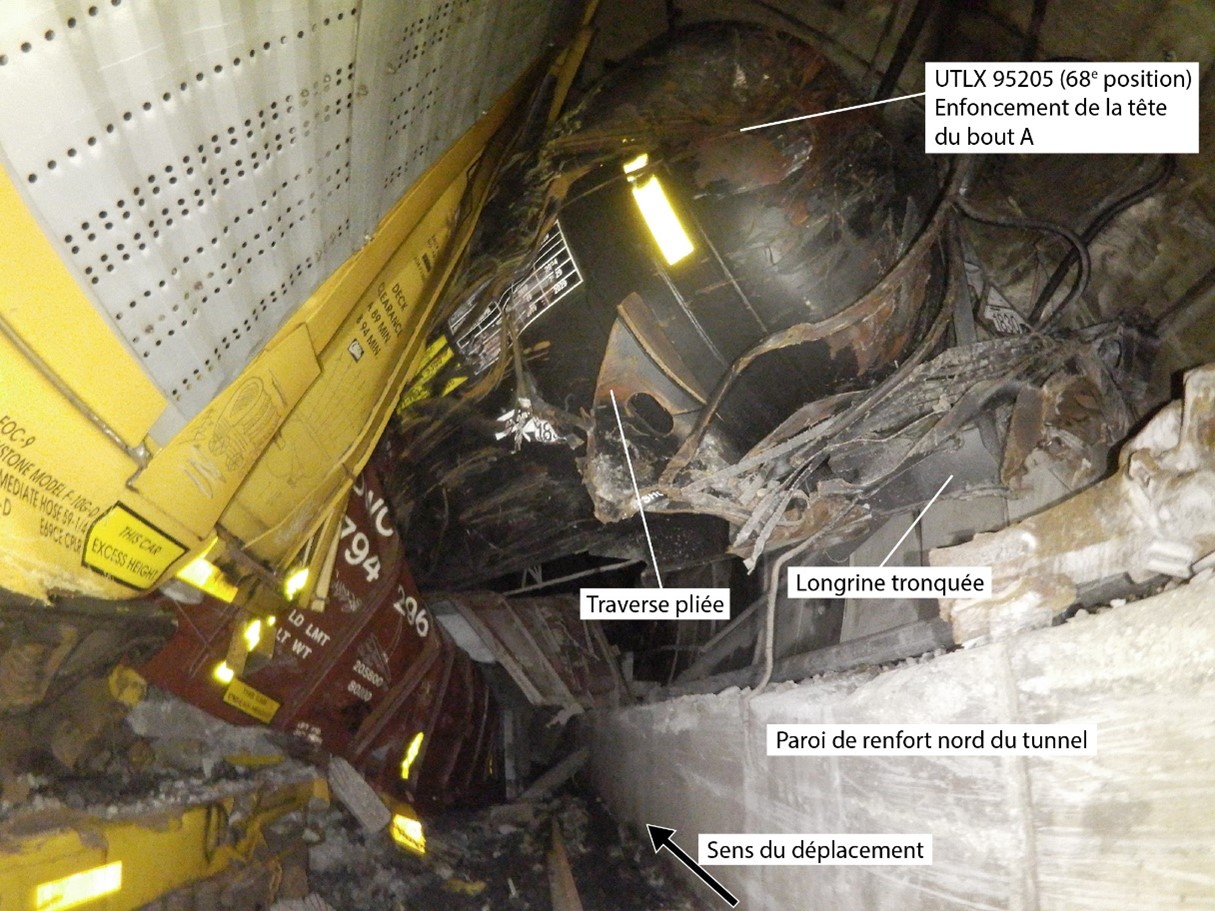 L’enquête a permis de déterminer que l’accident s’est produit lorsque le wagon-tombereau baignoire DJJX 30478, chargé de ferrailles d’acier, a subi une défaillance structurale et que le côté gauche du bout A du wagon s’est affaissé, ce qui a entraîné le déraillement du wagon dans le tunnel, du côté canadien de la frontière. Lorsque le wagon DJJX 30478 s’est affaissé, le bogie du bout A s’est décentré sous le wagon, ce qui a eu pour effet de renverser les 2 rails vers l’extérieur et de faire dérailler les wagons qui suivaient.