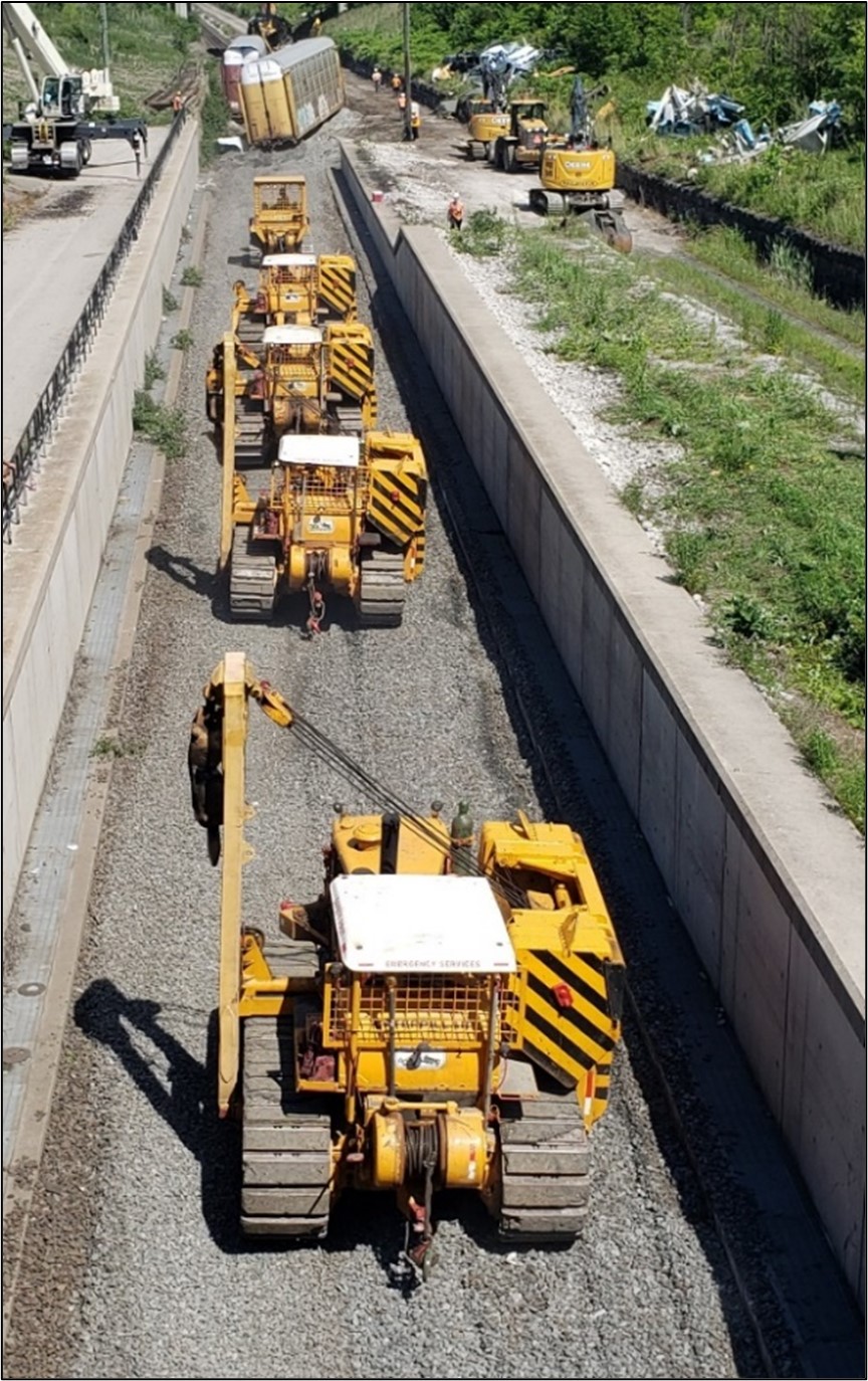 Des travaux de relevage visant à retirer tout le matériel roulant du tunnel ont été exécutés tant du côté canadien que du côté américain. Cependant, la plupart des wagons ont été traînés dans le tunnel vers le côté canadien. Les travaux de relevage du côté américain ont été lents et méthodiques, puisque les travaux étaient interrompus de façon périodique pour gérer le déversement d’acide sulfurique dans le tunnel. Par conséquent, les plans de travail de l’enquête étaient souples et ont été modifiés au gré de l’évolution des activités d’assainissement des lieux dans le tunnel.