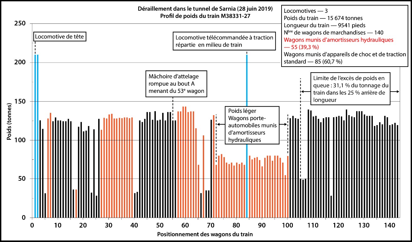 Après le retrait des 36 wagons de queue et l’ajout des 59 wagons de queue à Sarnia, le train se composait désormais de 2 locomotives de tête et de 1 locomotive à TR télécommandée (située entre les 81e et 82e positions), tirant un total de 140 wagons de marchandises. Ces derniers comprenaient 125 wagons chargés, dont 21 wagons-citernes chargés de MD, et 15 wagons vides, dont 3 wagons-citernes de résidus de MD. Le train mesurait 9541 pieds de long et pesait 15 674 tonnes.
