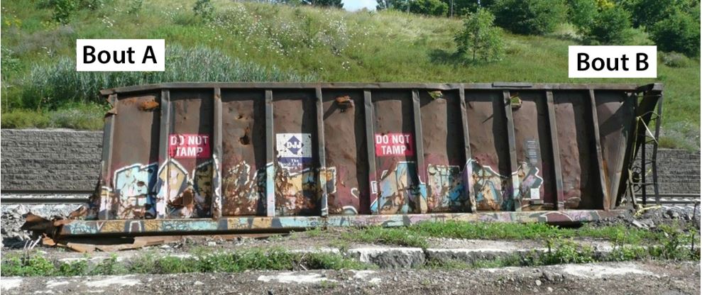 Le BST a retenu les services du Conseil national de recherches Canada (CNRC) pour effectuer des essais de compression en queue de wagon sur 3 wagons-tombereaux baignoires semblables au wagon DJJX 30478 qui se trouvaient dans la partie avant du train. Les essais visaient à évaluer la capacité de ces wagons à résister à 3 applications consécutives d’une force de compression longitudinale de 1000 kips dans leur état actuel d’usure après 40 ans de service. Les essais ont été effectués conformément aux critères du Manual of Standards and Recommended Practices de l’AAR pour la conception et la construction de nouveaux wagons de marchandises.