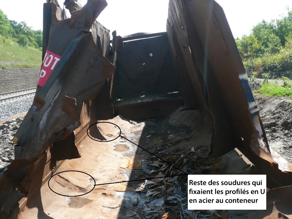 Le bout B du wagon DJJX 30478 (53e position) était relativement intact, mais il était entouré de ferrailles provenant du chargement du wagon, qui s’étaient répandues sur la surface de la voie (figure 8).
