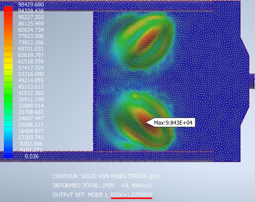 Un modèle du bout B du wagon DJJX 30478 à l’étude a par la suite été construit selon la même procédure en introduisant dans le modèle intact les défectuosités relevées. On a réduit l’épaisseur de la plaque de cisaillement de 0,31 à 0,19 pouce et on a ajouté une longue fissure relevée dans la plaque de cisaillement à l'endroit où elle est unie au brancard. L’analyse a révélé que la valeur propre de sortie était d’environ 0,41 (figure E4), ce qui indique que la charge critique de flambage du wagon était réduite à 410 000 livres-force (0,41 x 1 000 000) et que le bout B du wagon DJJX 30478 à l’étude pourrait se rompre lorsque les charges de compression atteindraient environ 410 000 livres-force.