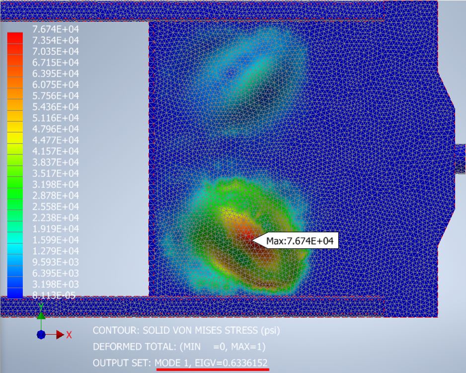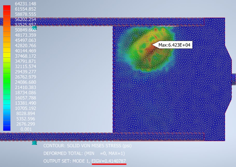 Les résultats (figure E3) montrent que la valeur propre de sortie est d’environ 0,63, ce qui signifie que la charge critique de flambage du modèle du wagon DJJX 30156 était réduite à environ 630 000 livres-force (0,63 x 1 000 000), ce qui correspond étroitement au résultat expérimental (628 000 livres-force) obtenu lors de l’essai de compression avec un écart relativement faible, ce qui indique que le modèle est d’une fidélité raisonnable.