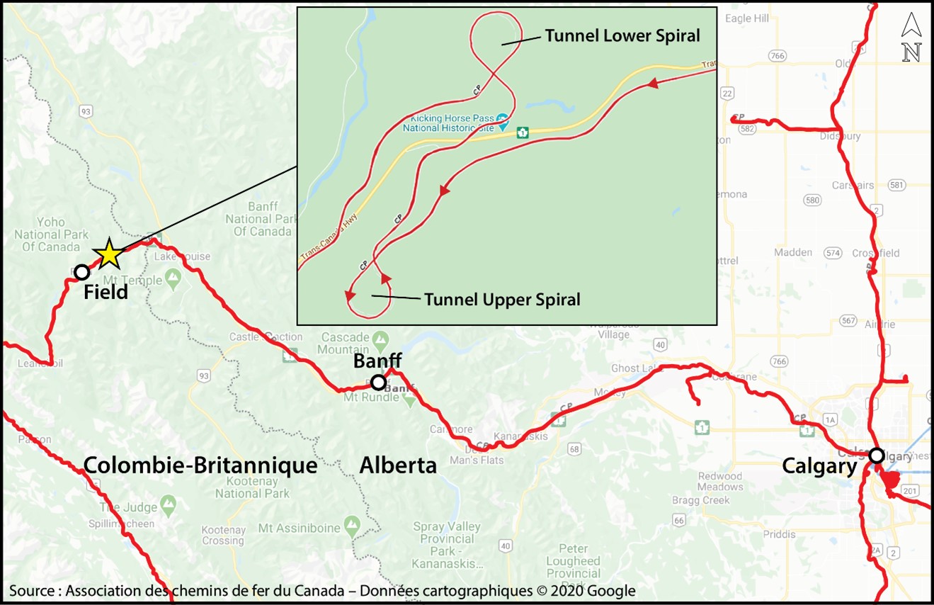 Il y a 2 tunnels en spirale sur Field Hill : le tunnel Upper Spiral et le tunnel Lower Spiral (voir la figure 1). Les tunnels suivent une trajectoire en spirale à travers les montagnes; cette conception permet aux trains de négocier plus facilement les changements d’élévation importants.