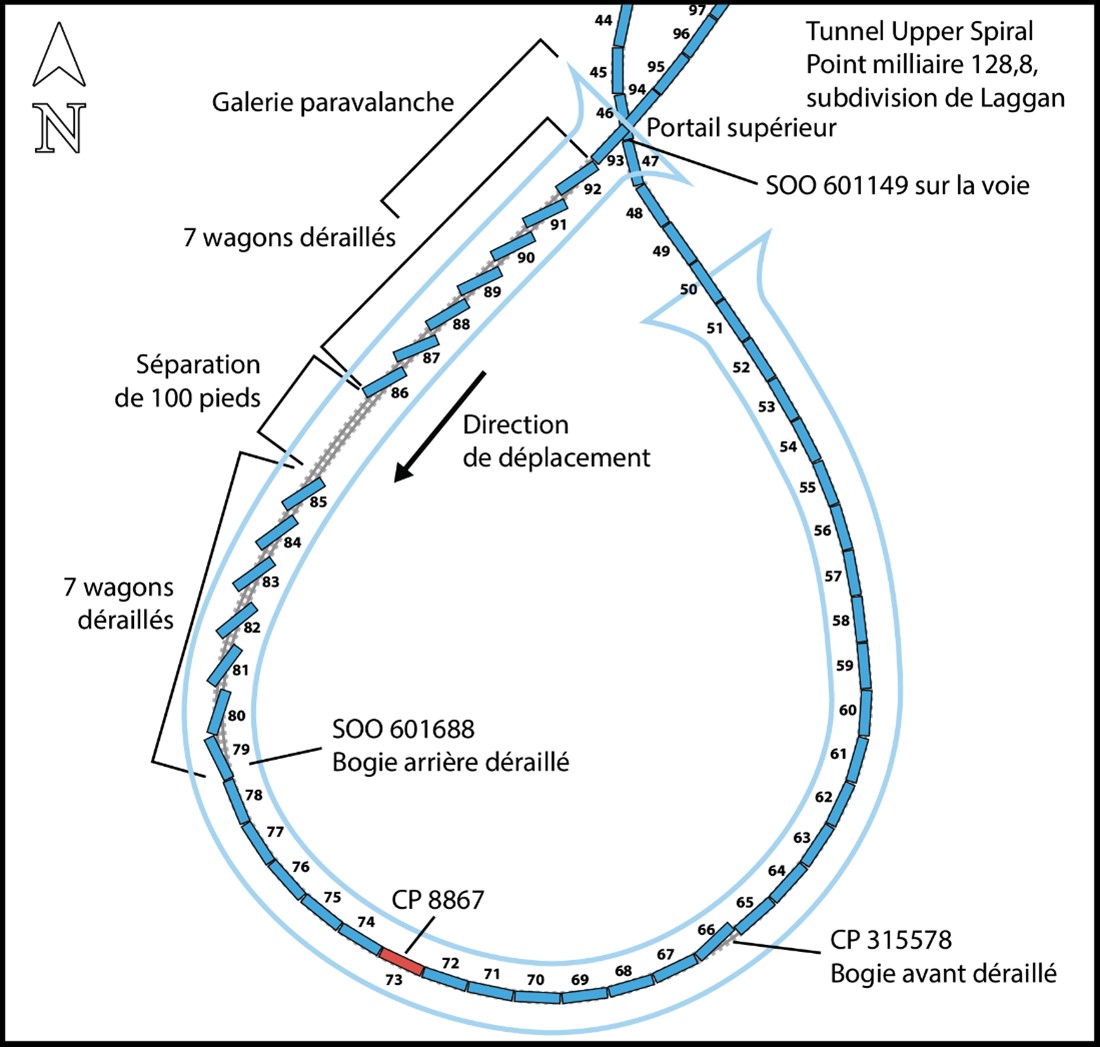La tête du train s’est immobilisée au point milliaire 129,95. Un total de 15 wagons avaient déraillé (position 66, devant la locomotive télécommandée, et positions 79 à 92, derrière la locomotive télécommandée); tous les wagons avaient déraillé dans le tunnel Upper Spiral. Tous les wagons plats qui avaient déraillé, sauf 1, étaient des wagons plats à parois de bout. Ils avaient déraillé sans se renverser et s’étaient mis en portefeuille à 3 endroits distincts (figure 2) :
