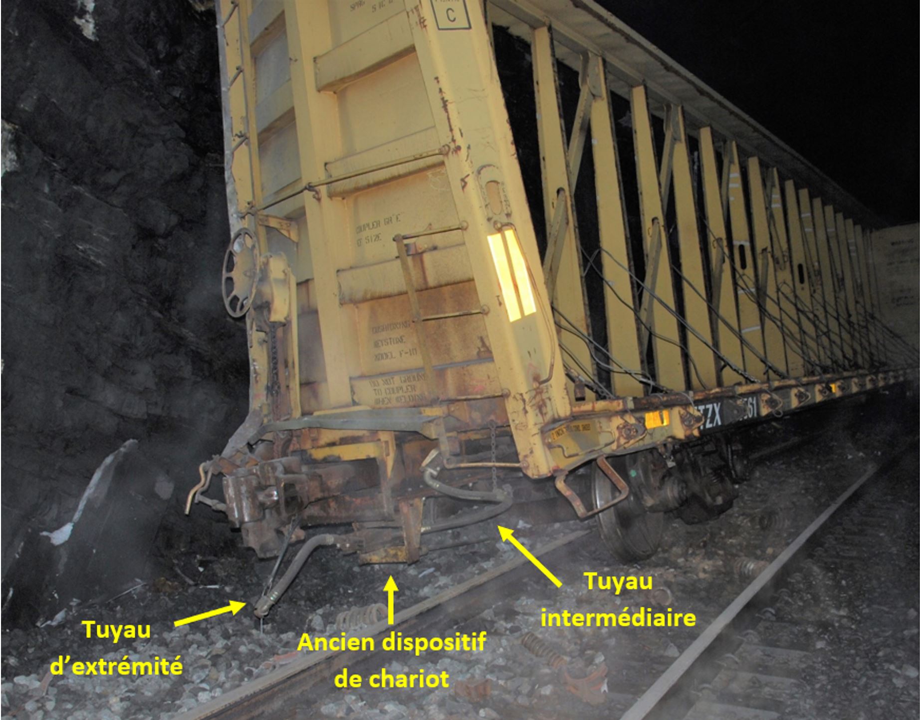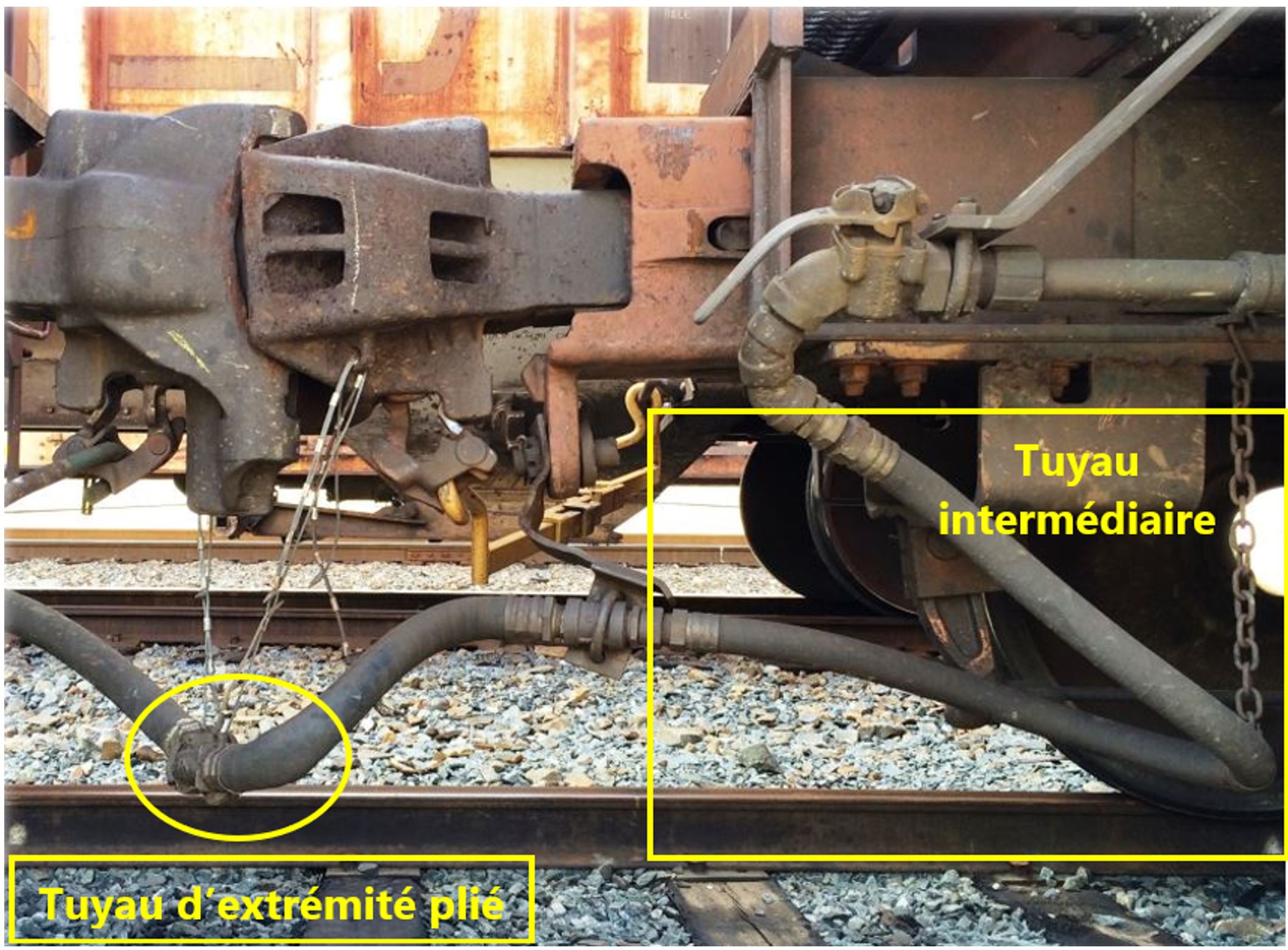 De plus, le CP a déterminé que le tuyau intermédiaire d’au moins 3 de ces wagons risquait fortement de se plier lorsque le jeu des attelages entre les wagons était à l’état de compression, en raison de la mauvaise configuration des chariots et/ou de problèmes de désalignement.