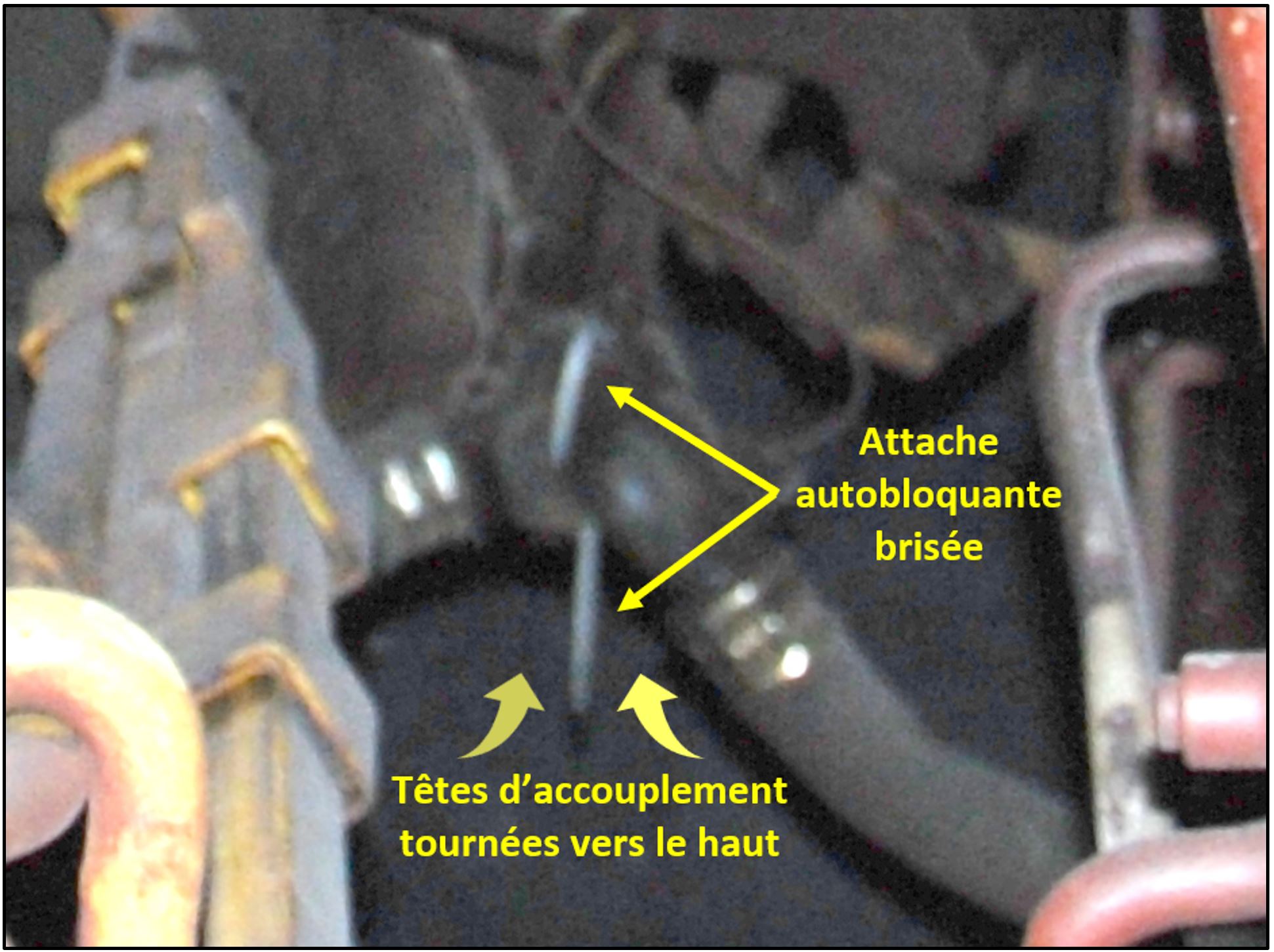 Les enquêteurs ont aussi remarqué que les têtes d’accouplement des tuyaux souples d’extrémité de certains wagons plats à support central de la série SOO qui ont déraillé avaient été fixées au moyen d’attaches autobloquantes; dans un cas, les têtes d’accouplement étaient tournées vers le haut (figure 4).