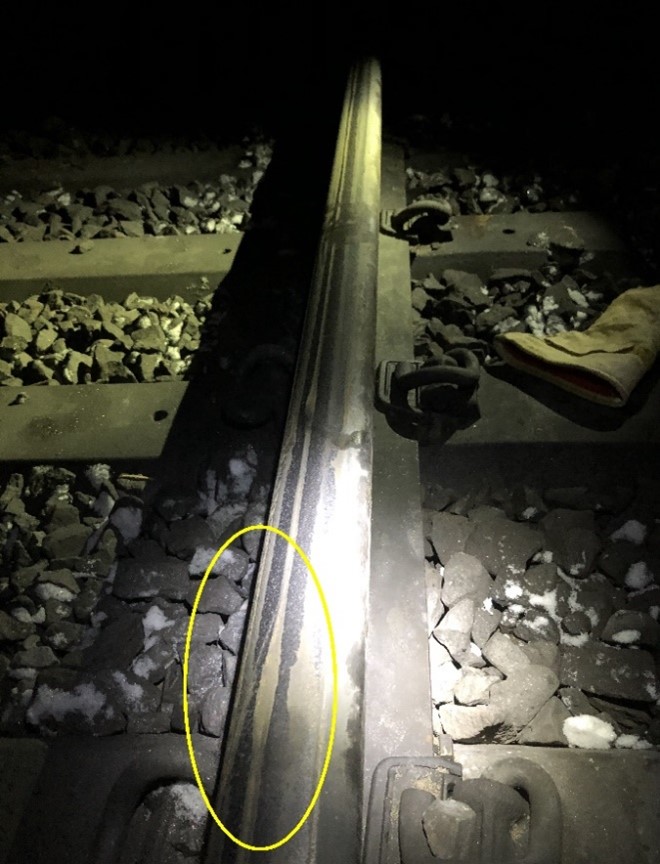 Des marques de boudin de roue étaient présentes sur le dessus du rail au point milliaire 128,9, ce qui indique qu’une roue avait passé par-dessus le rail extérieur (figure 5). On a déterminé qu’il s’agissait du point de déraillement.