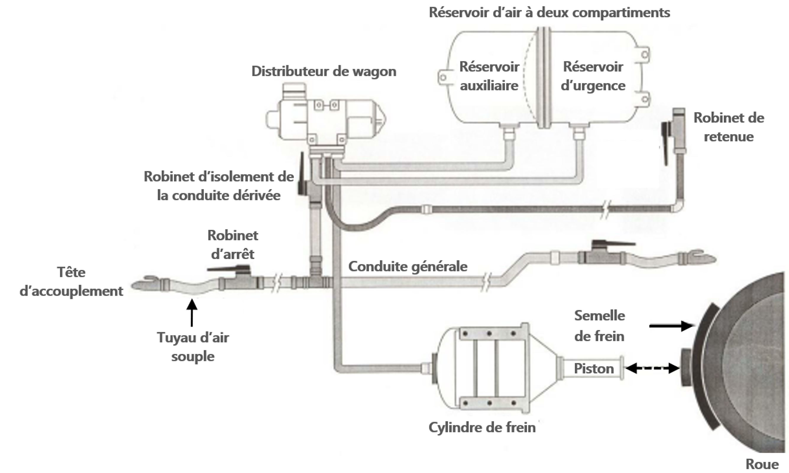 Chaque wagon est équipé des composants de freins à air de base suivants : une conduite générale rigide, des tuyaux souples d’extrémité, des robinets d’arrêt, un réservoir combiné de stockage d’air (qui comprend les réservoirs d’air auxiliaire et d’urgence), des cylindres de frein et un robinet de retenue, tous reliés à un distributeur de wagon (figure 7).