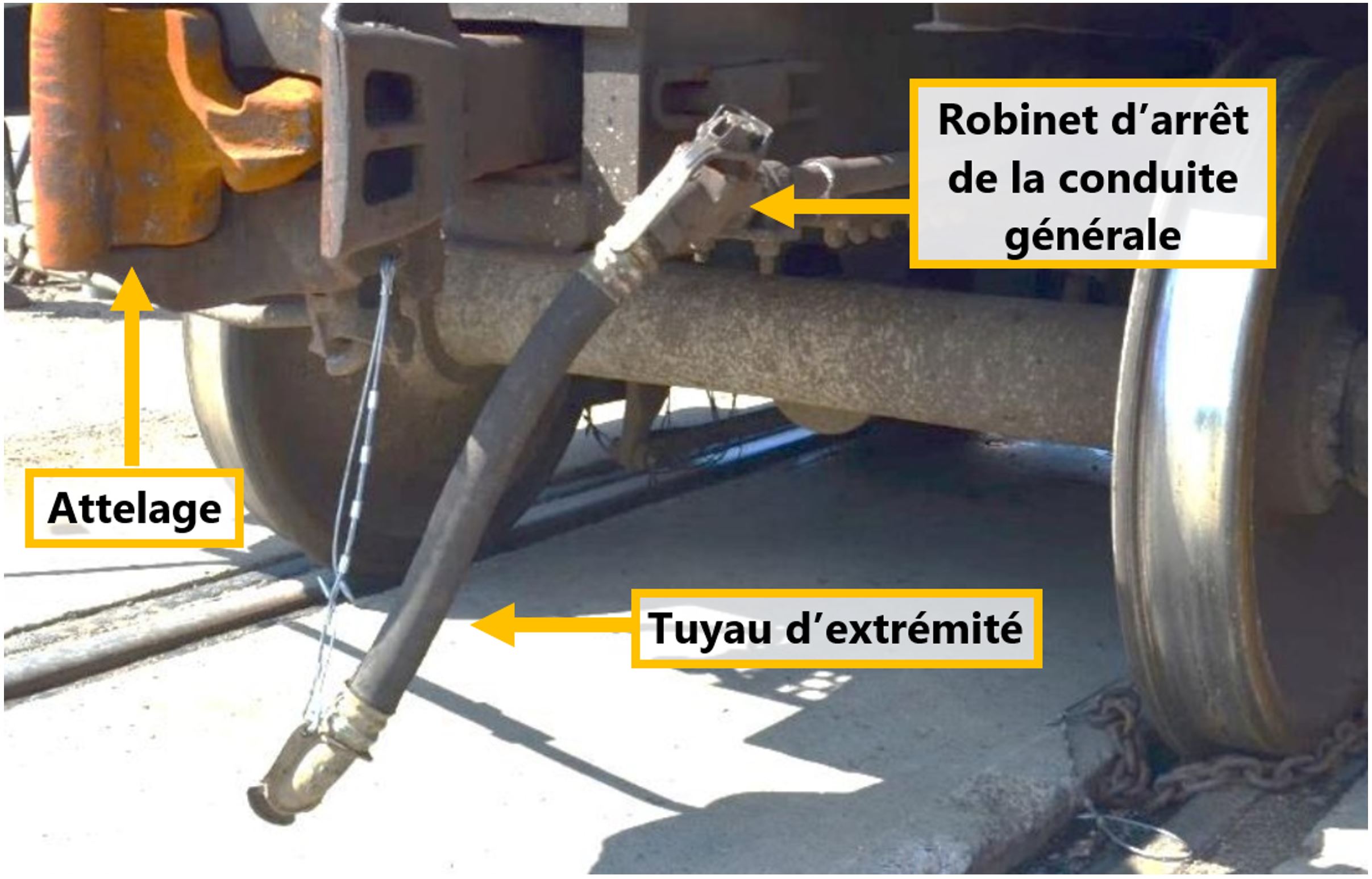 Un document sur les essais des dispositifs en bout de wagon des systèmes de freins, présenté en 2022 lors de la Railway Supply Institute Expo and Technical Conference, indique notamment ce qui suit [traduction] :