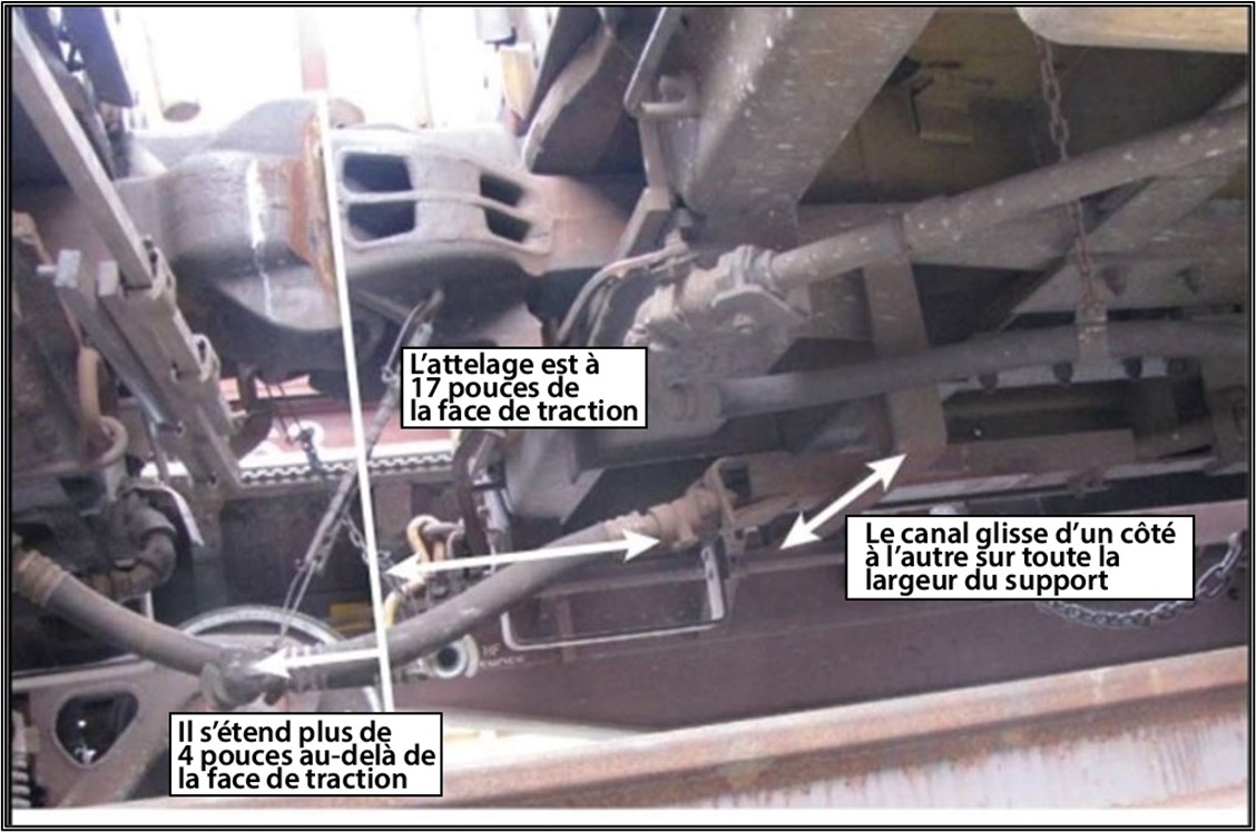 En inspectant les autres wagons qui avaient déraillé, les enquêteurs ont remarqué que le wagon plat à support central TTZX 85561 (position 85, le premier wagon juste avant la séparation de 100 pieds) était équipé d’un ancien dispositif de chariot en bout de wagon (figure 3)Note de bas de page 14.