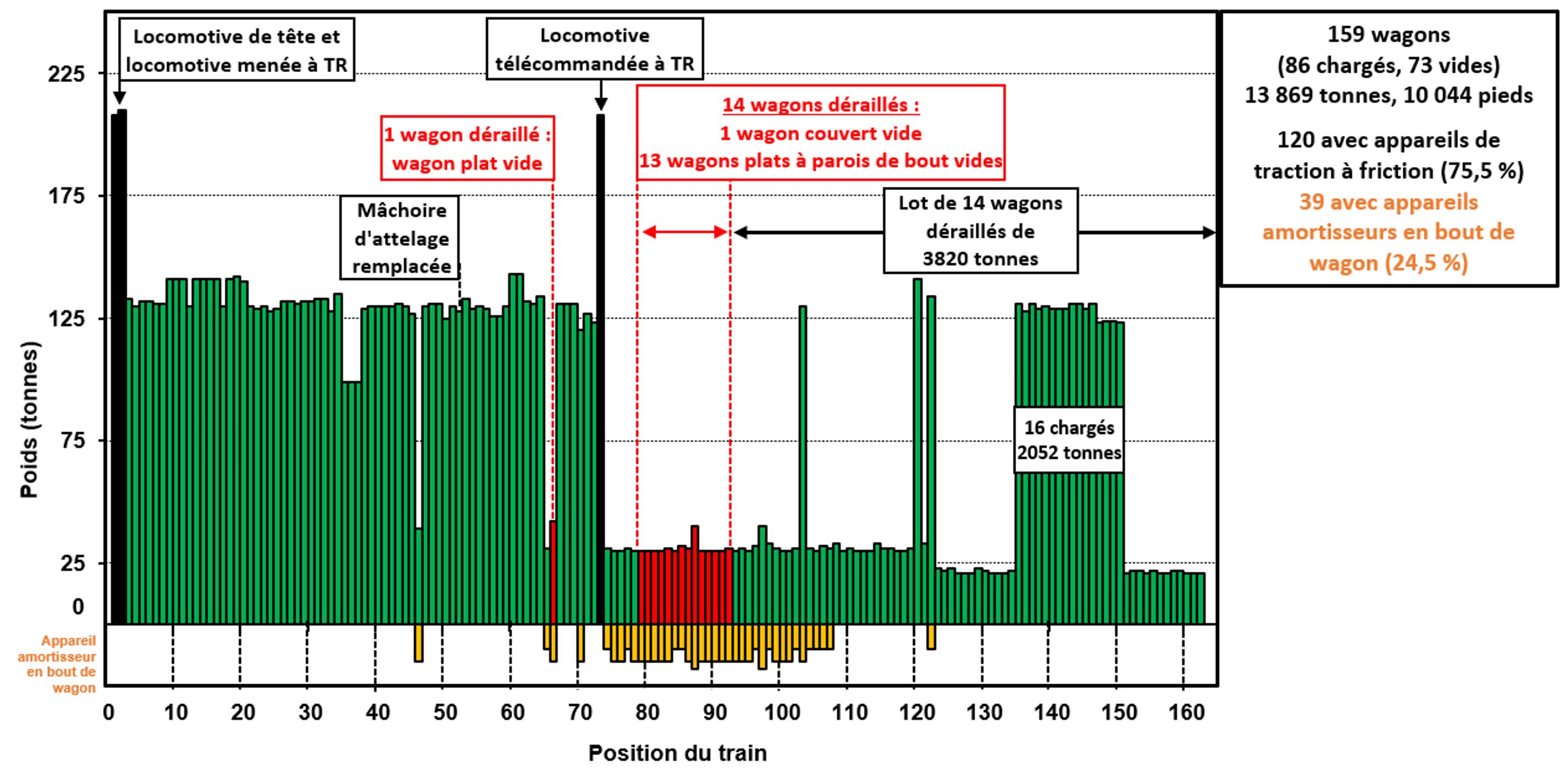 - un seul wagon plat à la position 66 (CP 315578, un wagon plat vide de 42 tonnes et de 94,8 pieds), situé 7 wagons devant la locomotive télécommandée; seul son bogie avant avait déraillé;