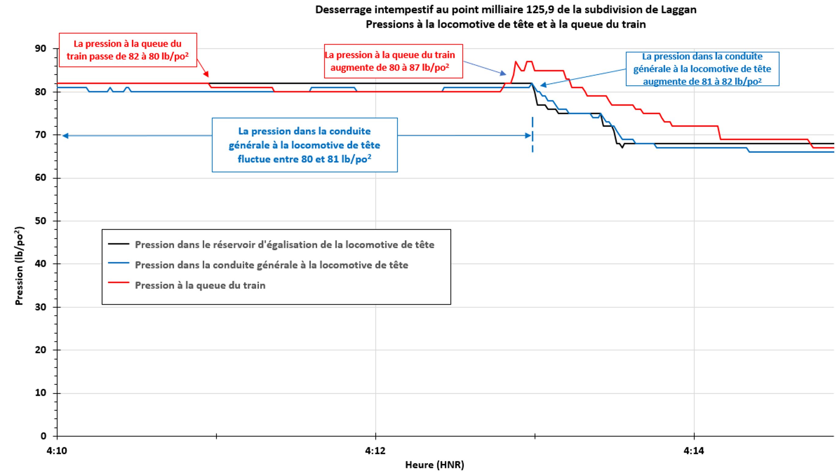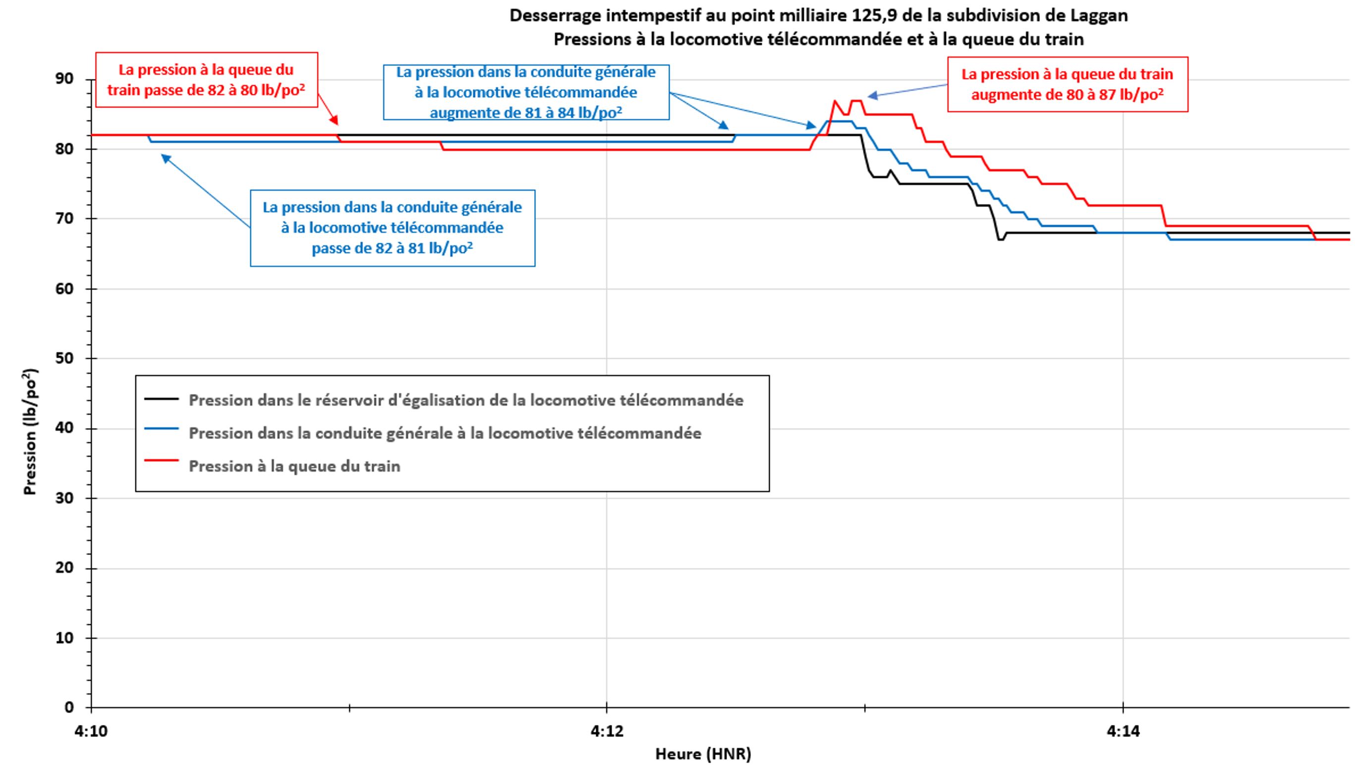 - À 4 h 12 min 59 s, soit 6 secondes plus tard, la pression dans la conduite générale à la locomotive de tête a aussi augmenté, passant de 81 lb/po2 à 82 lb/po2. Cette augmentation de la pression s’est produite 38 secondes après l’augmentation initiale de la pression à la locomotive télécommandée.
