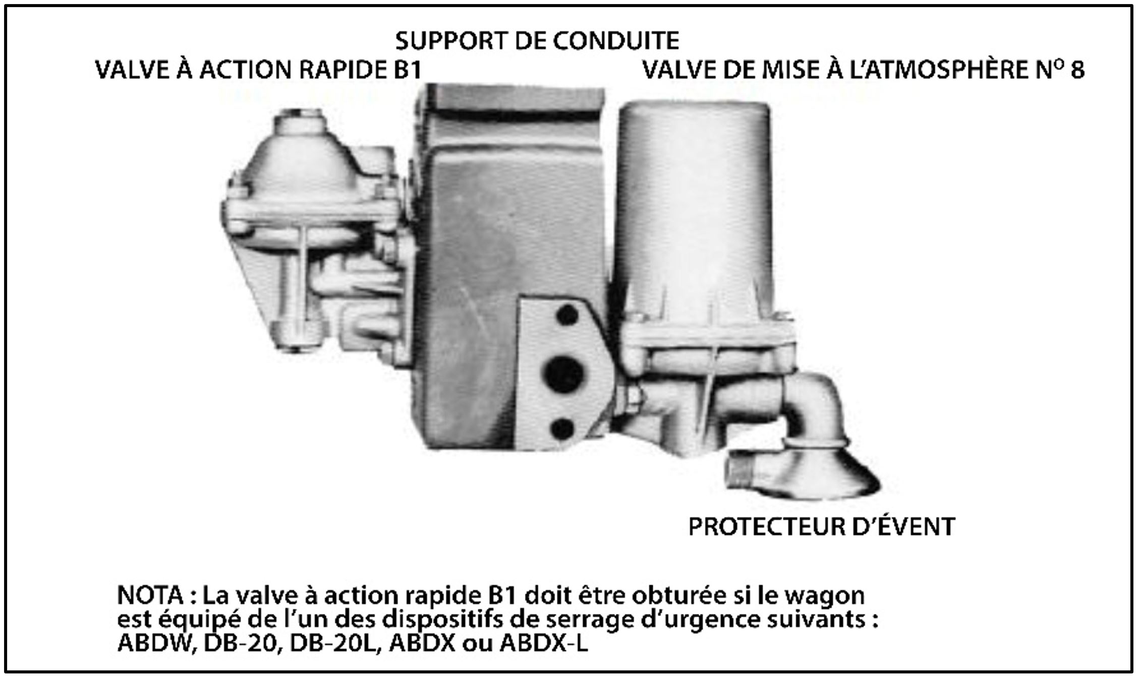 Les dispositifs de serrage d’urgence de nouvelle technologie comprennent une valve d’accélération de serrage (AAV)Note de bas de page 38, ce qui rend inutile la valve à action rapide B1, puisque sa fonction prévue est mieux remplie par la fonction de l’AAV. Par conséquent, lorsque la valve à action rapide B1 est encore fonctionnelle sur un wagon équipé d’un dispositif de serrage d’urgence de nouvelle technologie, les effets combinés de la valve B1 et de l’AAV pourraient déclencher un taux excessif de dépression dans la conduite générale lorsqu’un freinage est effectué, ce qui pourrait entraîner un freinage d’urgence intempestif.