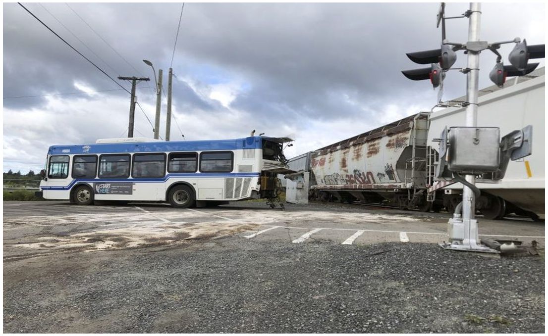 Le conducteur a ouvert la porte avant à la droite de l'autobus. Au moment où les 2 personnes montaient à bord, le passager avec une canne a donné une petite tape sur l'épaule du conducteur pour lui faire remarquer que la porte d'un petit compartiment de rangement au-dessus de lui était ouverte. Tandis que le conducteur tendait la main pour fermer cette porte, le train de marchandises roulant vers l'est a percuté le coin arrière droit de l'autobus.