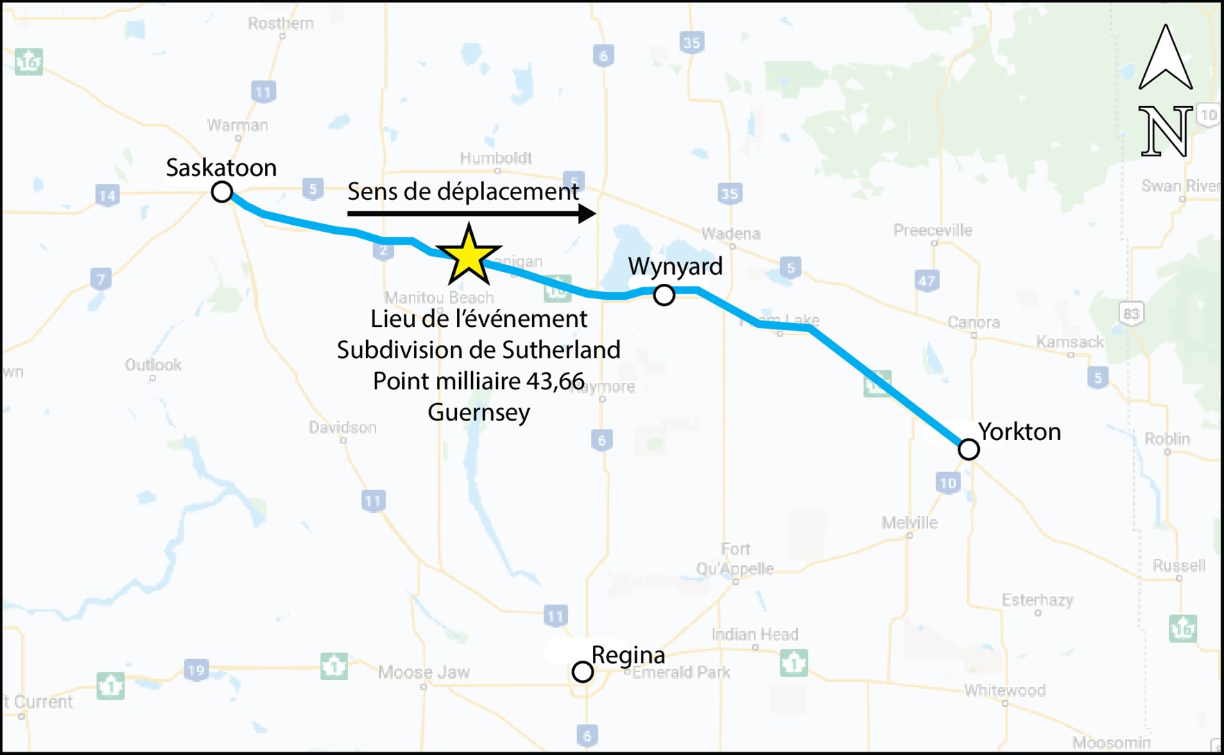 Le 6 février 2020, vers 4 hNote de bas de page 1, le train de marchandises 516-380 de la Compagnie de chemin de fer Canadien Pacifique (CP)Note de bas de page 2, un train-bloc transportant du pétrole brut (ONU 1267, classe 3, groupe d’emballage I) est parti de la gare de triage Sutherland à Saskatoon (Saskatchewan) (point milliaire 109,7 dans la subdivision de Sutherland du CP), à destination de Noyes (Minnesota, États-Unis) via Winnipeg (Manitoba). Le train était parti de Rosyth (Alberta) (point milliaire 126,0 dans la subdivision de Hardisty du CP).