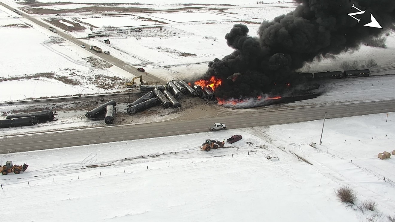 Le 6 février 2020, le train de marchandises 516-380 de la Compagnie de chemin de fer Canadien Pacifique, un train-bloc transportant du pétrole brut (ONU 1267, classe 3, groupe d’emballage I) circulait vers l’est à environ 44 mi/h dans la subdivision de Sutherland lorsqu’un freinage d’urgence provenant de la conduite générale s’est produit près de Guernsey (Saskatchewan). Une inspection subséquente a permis de déterminer que 32 wagons-citernes DOT-117J100-W avaient déraillé près du passage à niveau public du chemin Bloomfield, au point milliaire 43,66, détruisant au passage quelque 300 pieds de voie. Trente des wagons-citernes déraillés ont déversé environ 1,75 million de litres de pétrole brut. Un incendie s’est déclaré. On a évacué environ 85 résidents de Guernsey et fermé la route 16. Il n’y a eu aucun blessé.