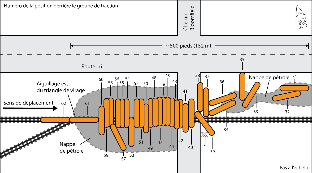 - Les 9 premiers wagons-citernes (de la 31e à la 39e positionNote de bas de page 8) avaient déraillé du côté est du passage à niveau.